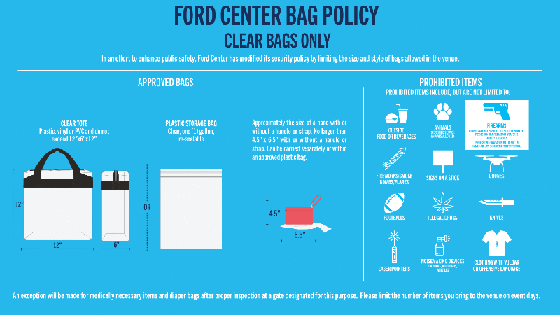 No outside food/drink, animals (except service animals), firearms, fireworks, signs on sticks, drones, footballs, illegal substances, knives, laser pointers, noisemakers, or clothing with profanity.